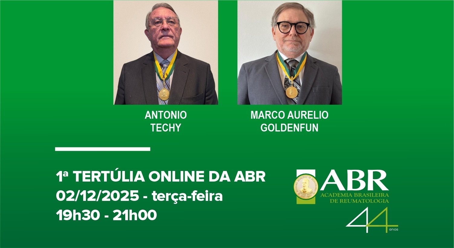 A Academia Brasileira de Reumatologia (ABR) promoverá, no dia 2 de dezembro de 2025, terça-feira, das 19h30 às 21h, a sua 1ª Tertúlia Online, um espaço de diálogo qualificado dedicado ao aprofundamento de temas relevantes para a prática médica.